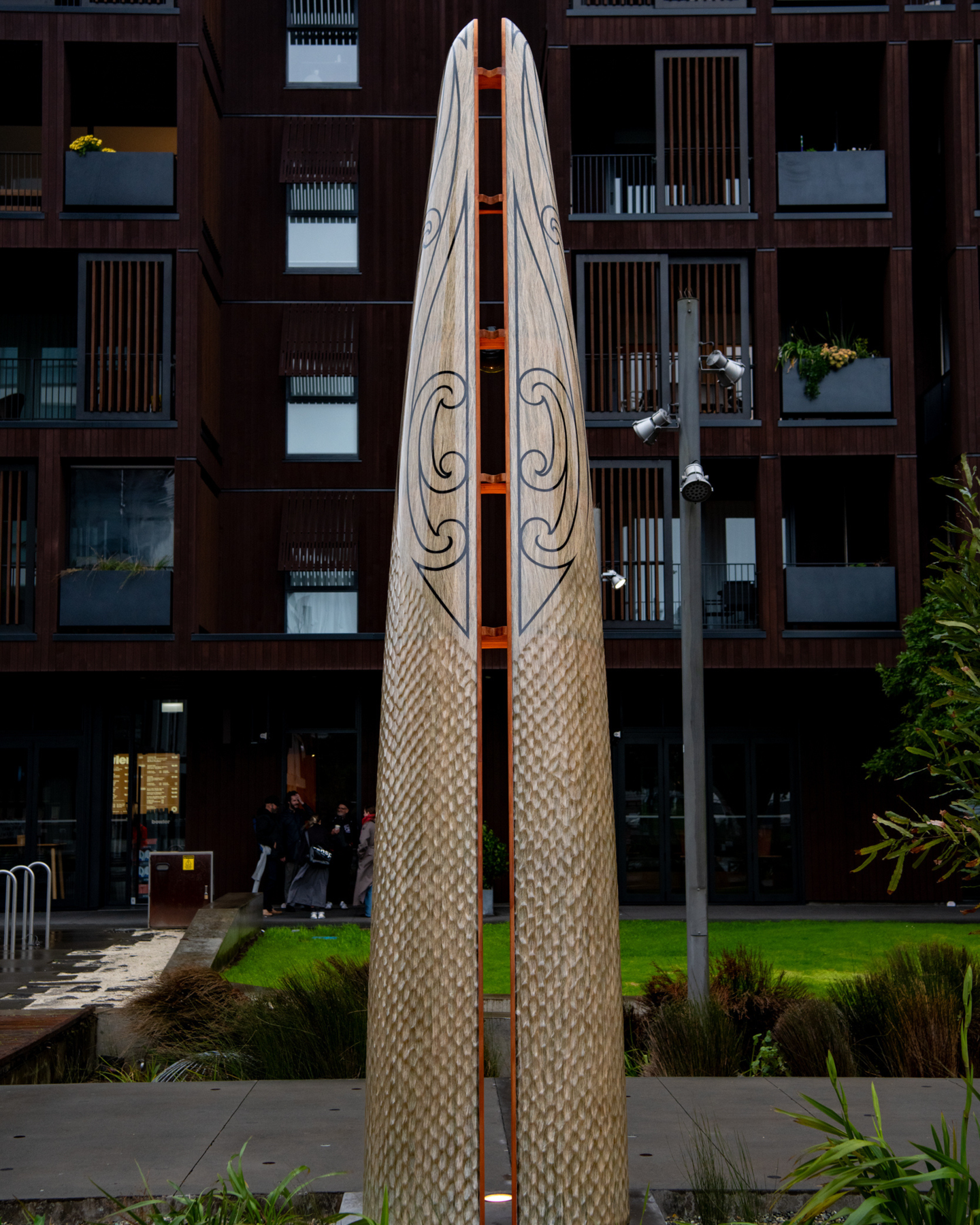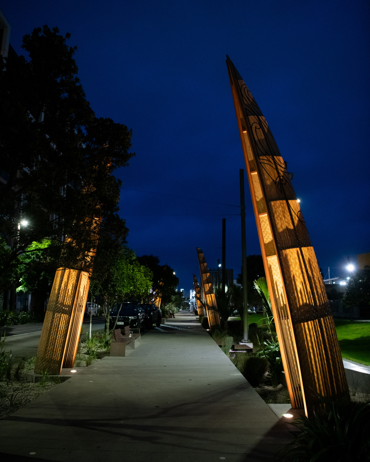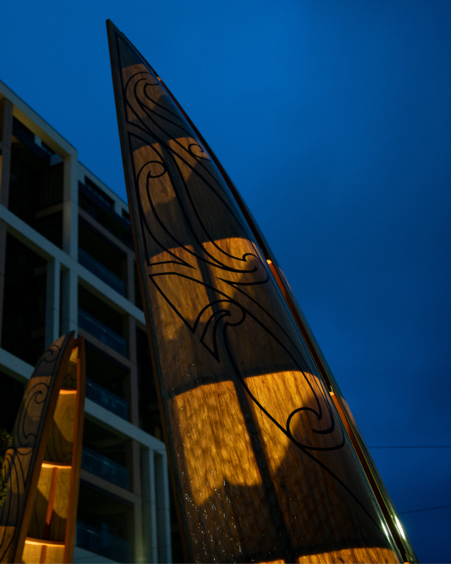 Created by local artist Graham Tipene, Waka Moana features nine towering waka inspired sculptures along the pedestrian pathway at Wynyard Quarter, Tāmaki Makaurau. Each hull, crafted from tōtara and GRP and rising 6 metres high, forms a totemic corridor linking land, sea and sky while honouring Māori culture and the area’s maritime heritage.